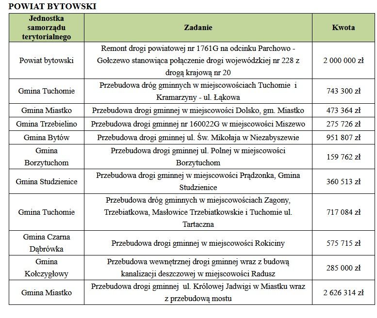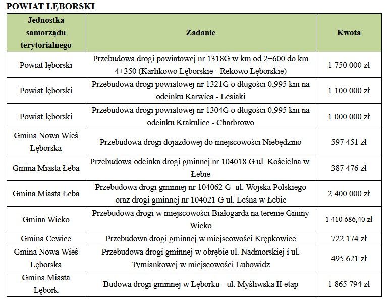 Lista zadań zakwalifikowanych do dofinansowania w ramach Rządowego Funduszu Rozwoju Dróg w Słupsku oraz w powiatach: słupskim, lęborskim, bytowskim, wejherowskim i puckim.