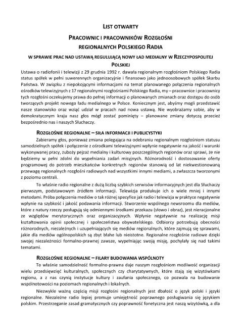 „List Otwarty Pracownic i Pracowników Regionalnych Rozgłośni Polskiego Radia” jest oddolną inicjatywą pracujących w nich ludzi. Podpisało się pod nim 741 osób - dziennikarze, realizatorzy, technicy, informatycy, pracownicy pionów administracyjnych z 14 regionalnych rozgłośni, czyli około 61 % wszystkich zatrudnionych.