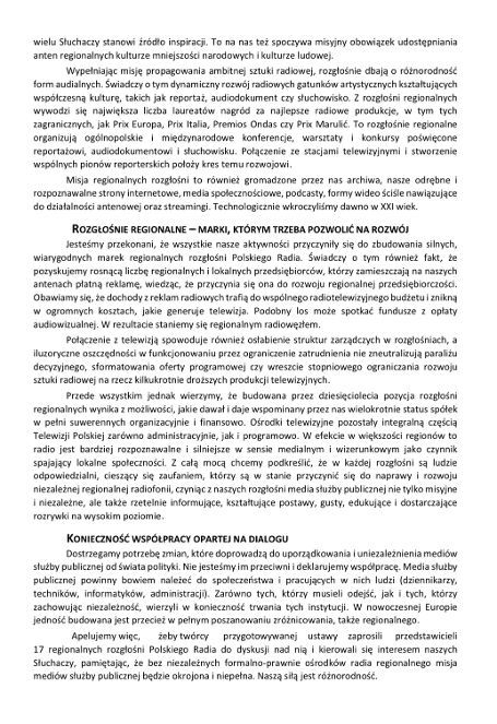 Wskazują oni ponadto na konieczność odpartyjnienia mediów służby publicznej oraz zaznaczają, że wśród propozycji krążących w przestrzeni publicznej są też bardzo ważkie propozycje rozwiązania tych problemów, dotyczące finansowania mediów i ich oddzielenia od świata polityki. Apelują również, by w pracach nad ustawą medialną uczestniczyli przedstawiciele rozgłośni regionalnych Polskiego Radia.