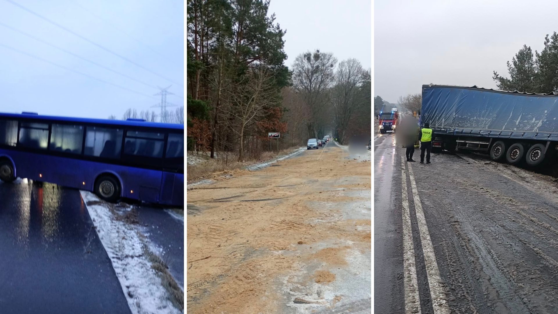 Na drodze krajowej nr 11 w miejscowości Krępsko naczepa pojazdu ciężarowego zjechała do rowu. W miejscowości Krzewina doszło do trzech zdarzeń, w tym kolizji trzech pojazdów osobowych, kolizji dwóch pojazdów ciężarowych, a autobus stanął w poprzek drogi. Z uwagi na ekstremalne warunki dochodzi do utrudnień w ruchu drogowym.